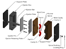 • Molten plastic enters the mold through the sprue . Additional channels, called runners, carry the molten plastic from the sprue to all of the cavities that must be filled.